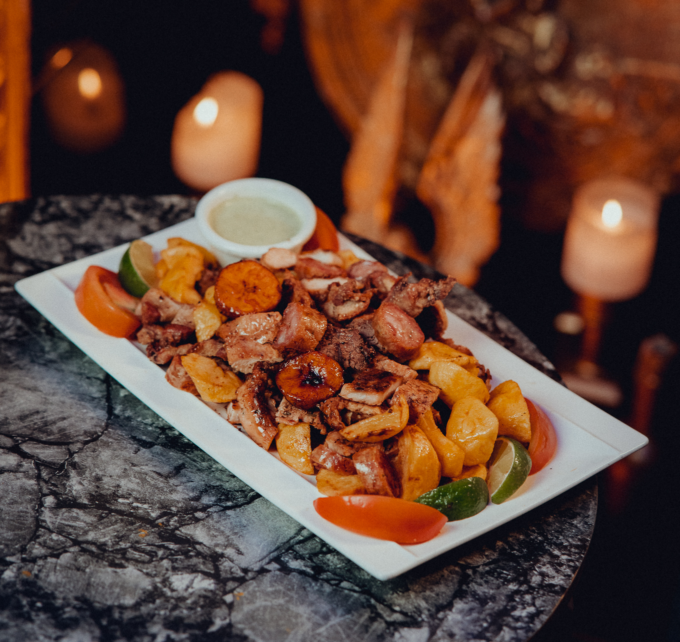 Carne de cerdo, Tomate, Papa Amarilla, Guacamole y Maduro.